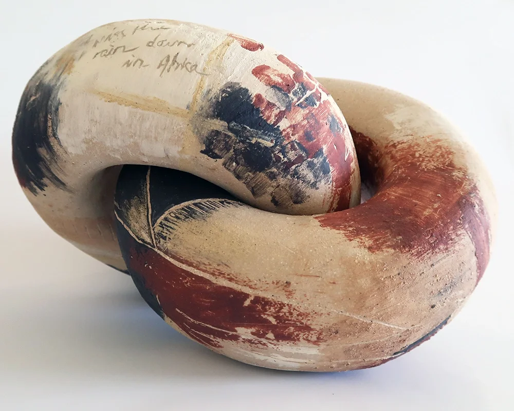 The two interlinked rings symbolise my dual identity, where I am neither fully African or Australian. Although I have not lived in Africa for over 20 years, the marks and forms I create seem to subconsciously echo my African roots.