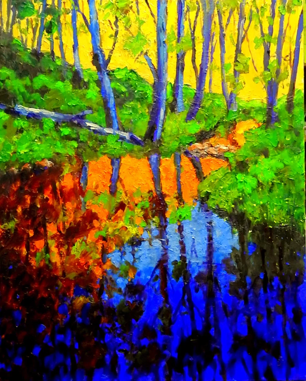 Being of the same mind and following those who have cut through the pathways of art logic, I have tried in this painting to push the light in a contemporary mode and go beyond ones normal bounds of reality. In this case, a quiet stream in Victoria basking in evenings soft light has been made to exploit the colour that was hidden to normal eyes.