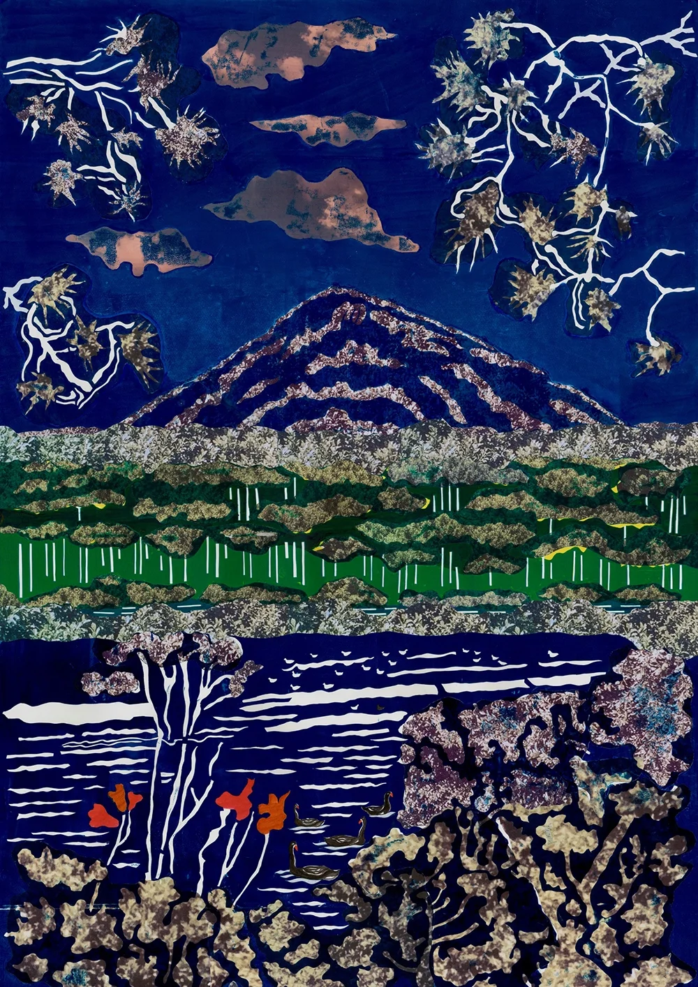 Graham Bell | Black swans on Lake Doonella | 2024 | relief print on acetate with chine collé and collage | 136 x 96cm