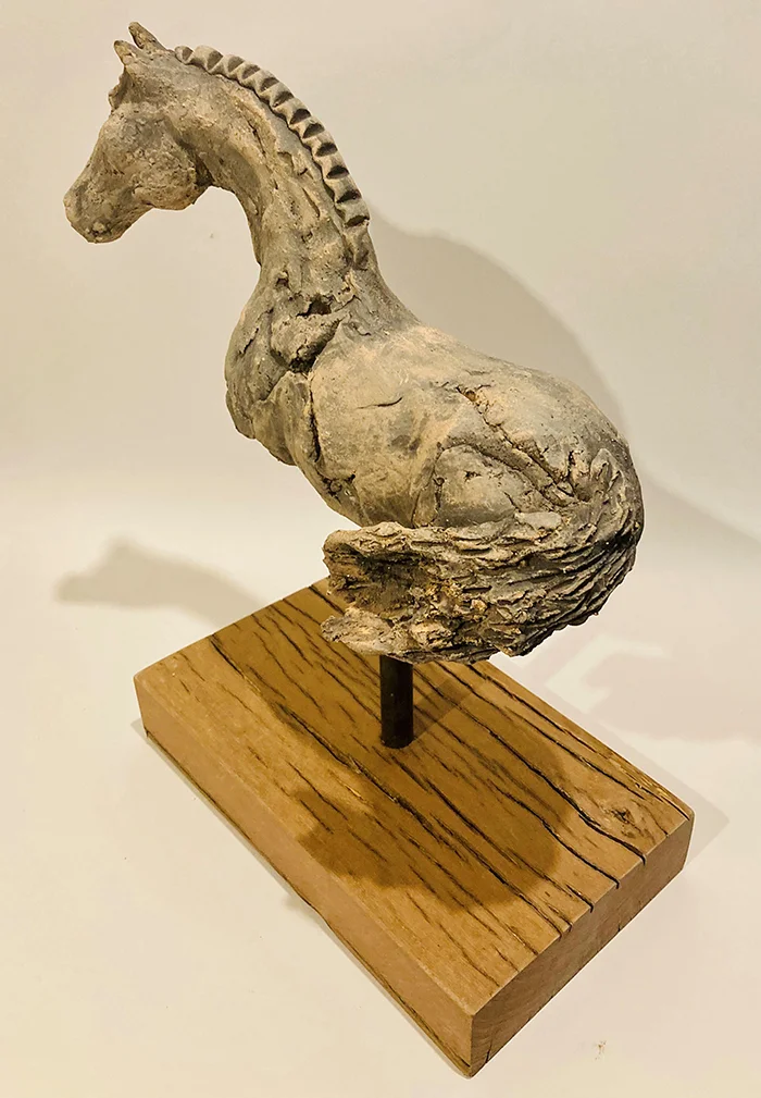 Julie Field | The OTT - A Life Beyond the track | 2020 | ceramic sculpture on aged timber stand | 35 x 30 x 15 cm