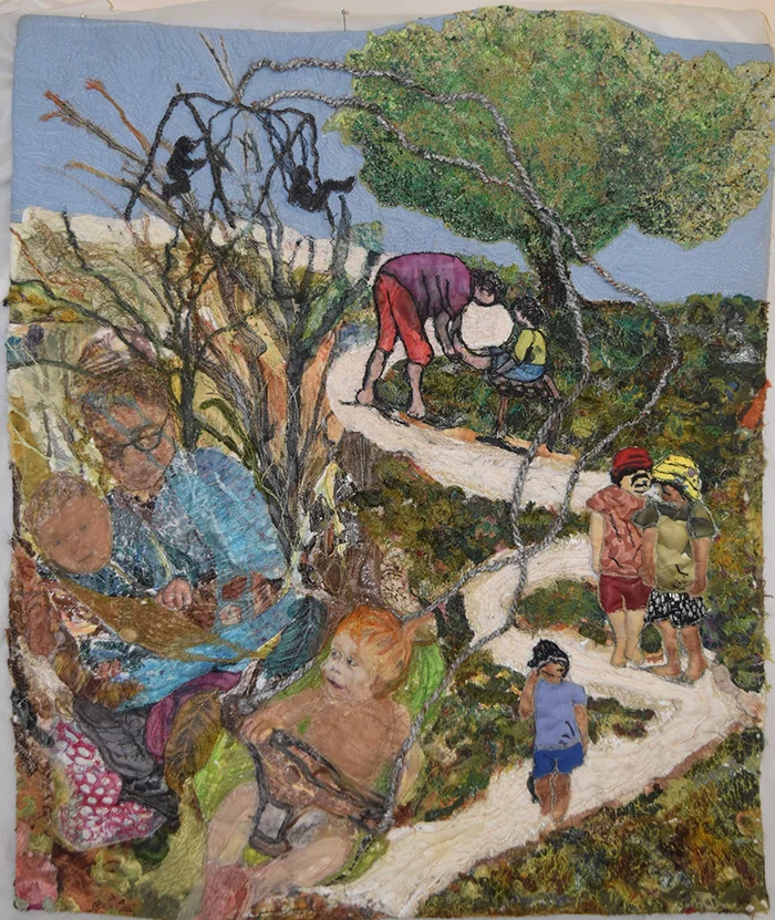 Please Mum? Can we go to the park? | 2022 | textile - recycled cloth, mostly cotton, free machine embroidery, stencils, quilted | 73 x 58cm
