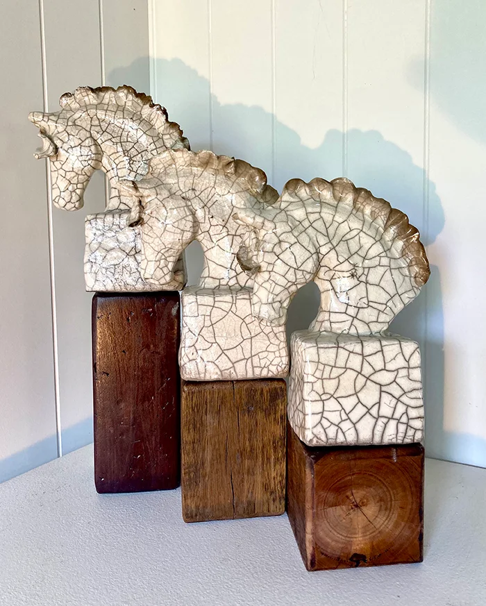 Julie Field | Sunshine Coast Show - The Line Up | 2022 | raku ceramics on recycled fence posts | 45 x 32 x 30cm