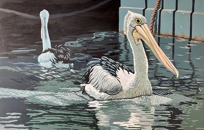 Harbourside Pelicans | 2022 | oil on board
