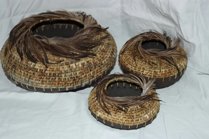 Cindy Mills | Vessels | 2024 | pandanus, clay and emu feathers | 13 x 42cm