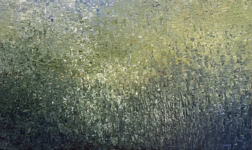 The intention of my work is to evoke an emotional response or a memory. The painting is an abstract colour field but is also suggestive of a scene, a landscape or a fragment of a story. I walk in the forest most days, early morning, in most weather conditions. Deep Forest is a compilation of many years of scenes from memory recalled and imagined or partially remembered and sometimes forgotten. There is a visual tension between the surface of the painting, of thick textural paint applied in a rhythmic pattern in layers and the suggested image.
