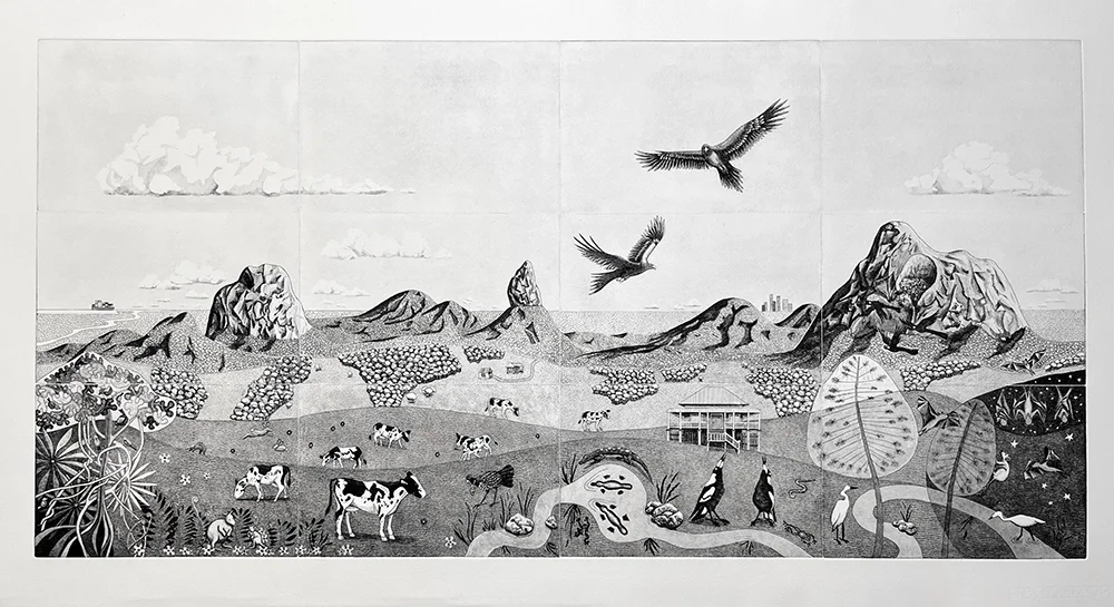 Views From My Window - The Maleny Story | 2025 | copper etching, aquatint and spit-biting, ed. 1/20 | 76 x 118cm (framed)