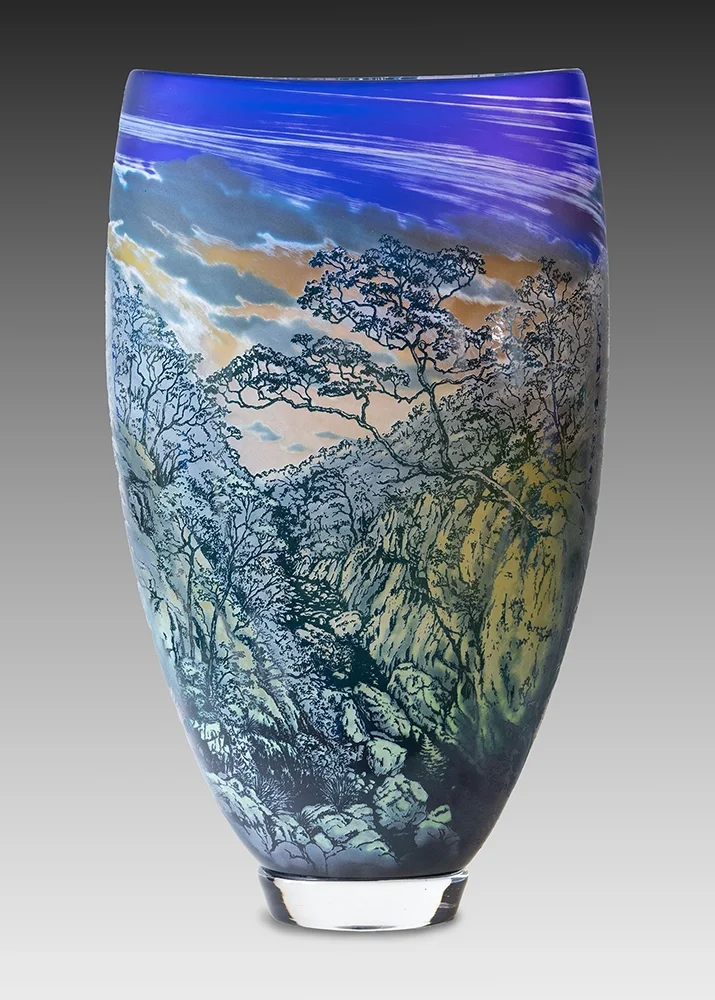 This work is the culmination of several complex stages. I have been working with hot glass for the last 40 years and my studio on the Blackall Range is where this work was created. Inspired by bushwalking into wilderness areas, my drawings become the theme for each piece.