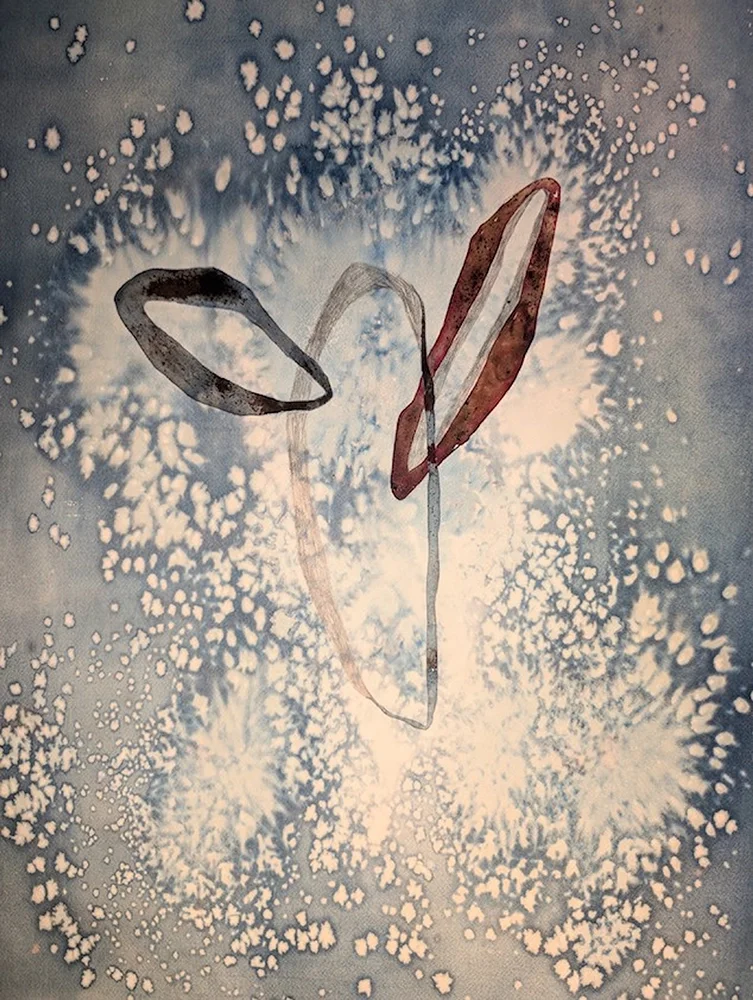 Katie Harris-MacLeod | Falling through space (the three of us) | 2024 | cyanotype, salt, bloodwood tree sap and graphite on 300gsm watercolour paper | 76 x 56cm