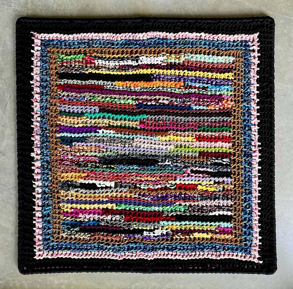 Money Matrix weaves jeans, shirts, pants, the threads of someone’s history, employment, community, and socio-economic struggle, the ephemera of life. The vibrant colours imbue hope and comfort, while the intricate patterns evoke the interwoven stories of our life.