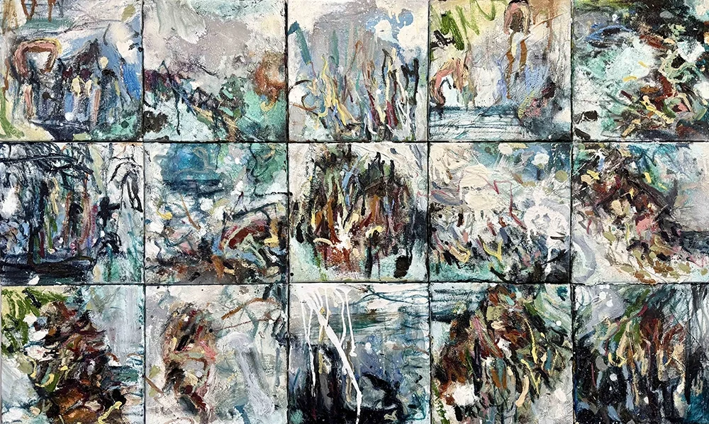 Weathered poem of the Coolum Bays | 2025 | acrylic and mixed media on canvas | 92 x 154cm (15 panel work)