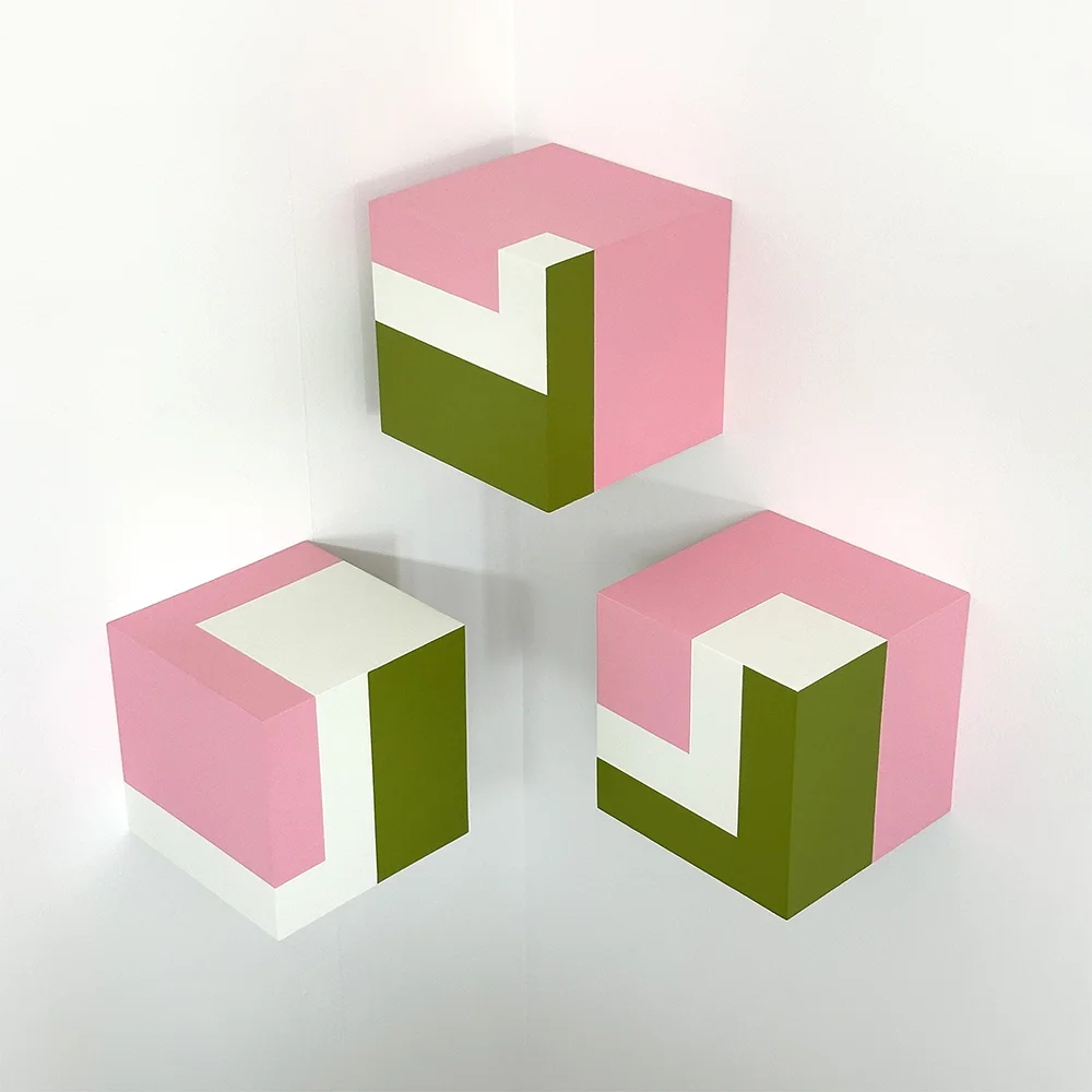 Petalia Humphreys | EPLC series #2, three pieces in fourth composition | 2023-25 | low sheen interior/exterior acrylic (Pacifika, Coconut Ice and Suzy's White) on plywood | 50 x 50 x 45cm (installed)