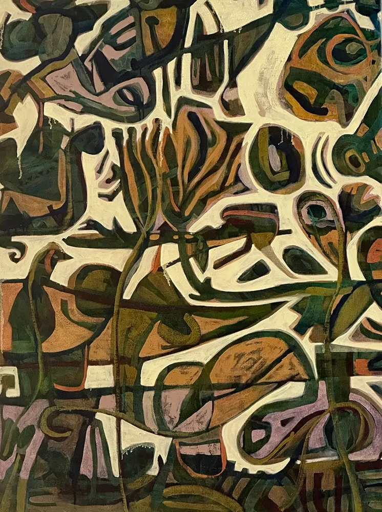 Garden in Dulong captures the vibrant essence of my garden, celebrating the dynamic interplay of life and movement within this serene space. Infused with rich colours—olive greens, soft lilacs, and warm golds—interwoven with dark greens and deep blues over a pale creamy yellow background, each hue reflects the lush vitality of summer, evoking sensations of warmth and tranquillity.