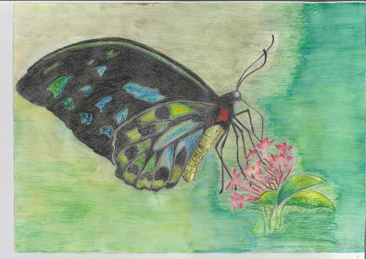 Aimee Palagama | Richmond Birdwing Butterfly | 2025 | mixed media_watercolour pencils and posca markers on paper | 30 x 42cm