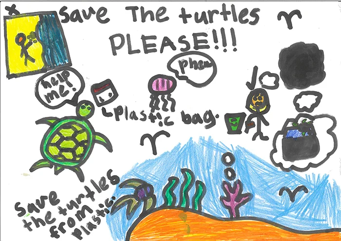I was inspired to create work of art to help our animals. They have no voice. One way is to throw rubbish away properly. My artwork is a plea for people to throw in the bin to save the turtle. They think plastic bags are jellyfish, eat them and die. We need to protect them and all animals
