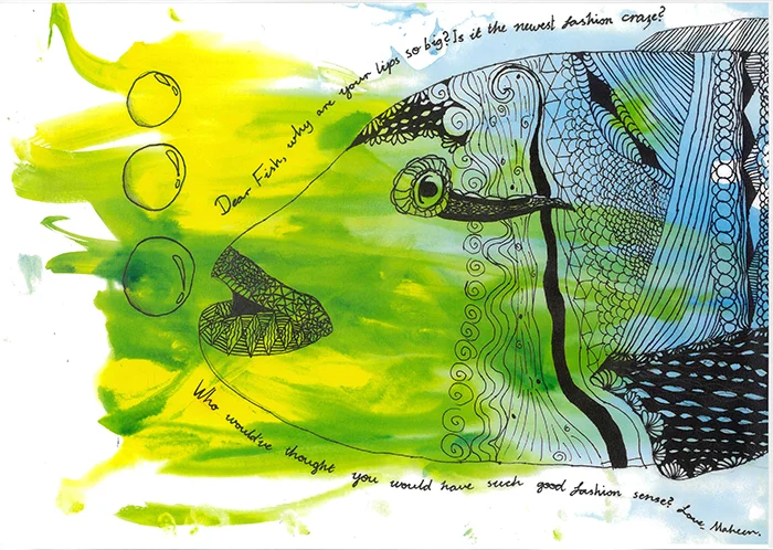 Maheen Naeem | Fishy Wishy | 2022 | black fine pen, watercolour, rock salt on paper | 29.4 x 41.5cm