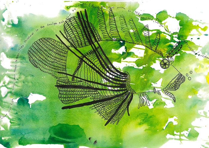 Neveah Evans |The Cat Fish | 2022 | black fine pen, watercolour, rock salt on paper | 29.4 x 41.5cm
