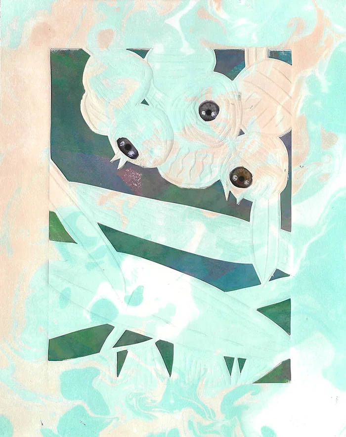 Marina Krueger | I know you can see me, but can you find me? | 2022 | collagraph marbling collage