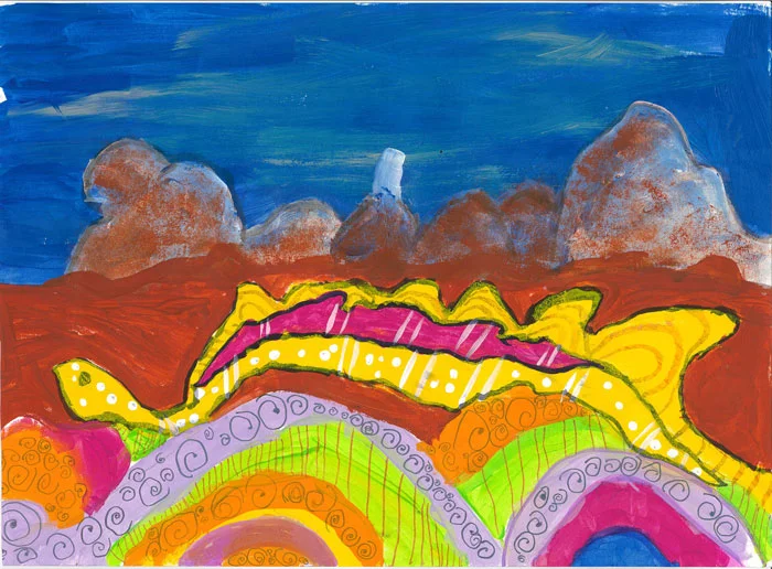 The Rainbow Serpent making the Glasshouse Mountains | 2024 | acrylic paint and pen