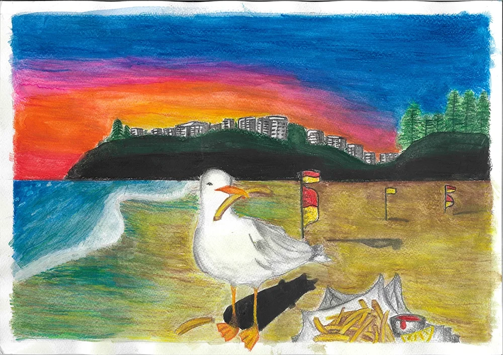 Emma Harrison | Chips for Dinner | 2025 | watercolour pencil, graphite pencil and Posca pen on paper | 29.7 x 42cm