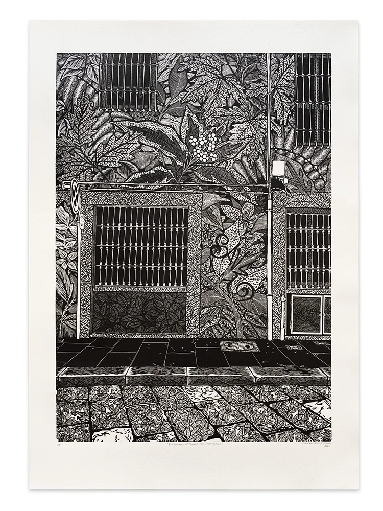 Fragments of Torino: an observation draws on my impressions and experiences during a residency program in Torino (Italy) in late 2023. Using printmaking as a tool to capture my visceral impressions of place, I found myself responding to the organic forms that interact with the built environment of the city. While exploring Torino, I gravitated towards intimate observations of the old Italian architecture. The delicate engraved details that characterise these buildings are being worn away over time while also being layered with new and unexpected details. As I observed these buildings I was fascinated by the textures and movement of both nature and graffiti and how it redefines the way the architecture is experienced. There is a continuity within the evolving environment of this building as people and nature add to its story.