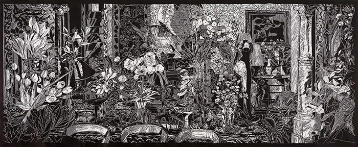 Christine Druitt-Preston | Olley Land - Take a place at the table | 2019 | lino block on Wenzhou paper | ed.5 | editioned by Brenda Tye | 72 x 138cm