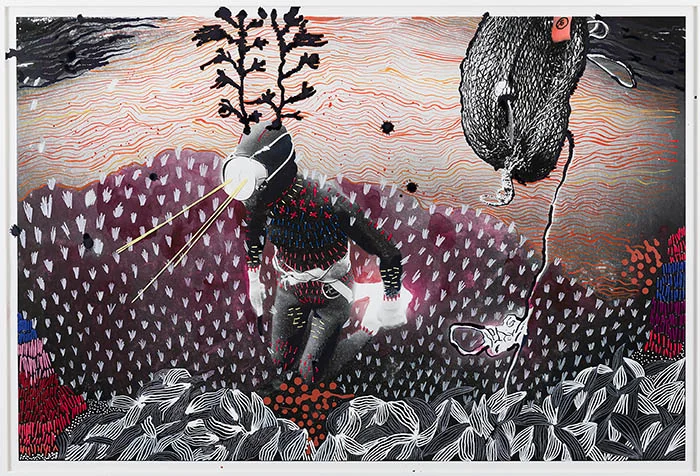Zoe Porter in collaboration with Aiko Ohno | Under the Surface | 2021 | digital print on Hahnemuhle paper, ink, watercolour, acrylic paint, pencil and embroidery thread | 70.5 x 100cm