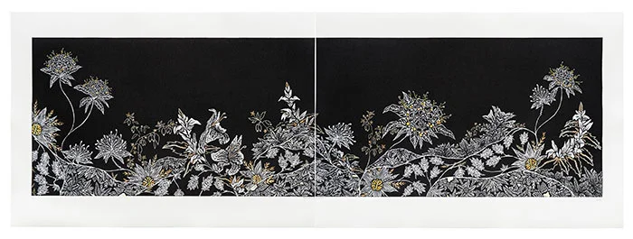 Undulations | 2022 | vinyl-cut relief print with hand-coloured watercolours | 50.5 x 144cm