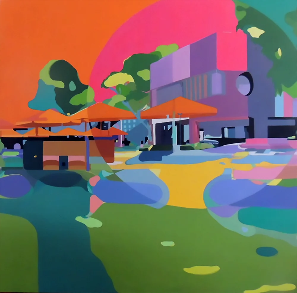 The Hub, is part of a series of paintings commenting on my own reflections and experiences living in Melbourne’s suburbia, and the changes that I have observed in the past ten years. The series comments on nostalgia, development, transport, and community.