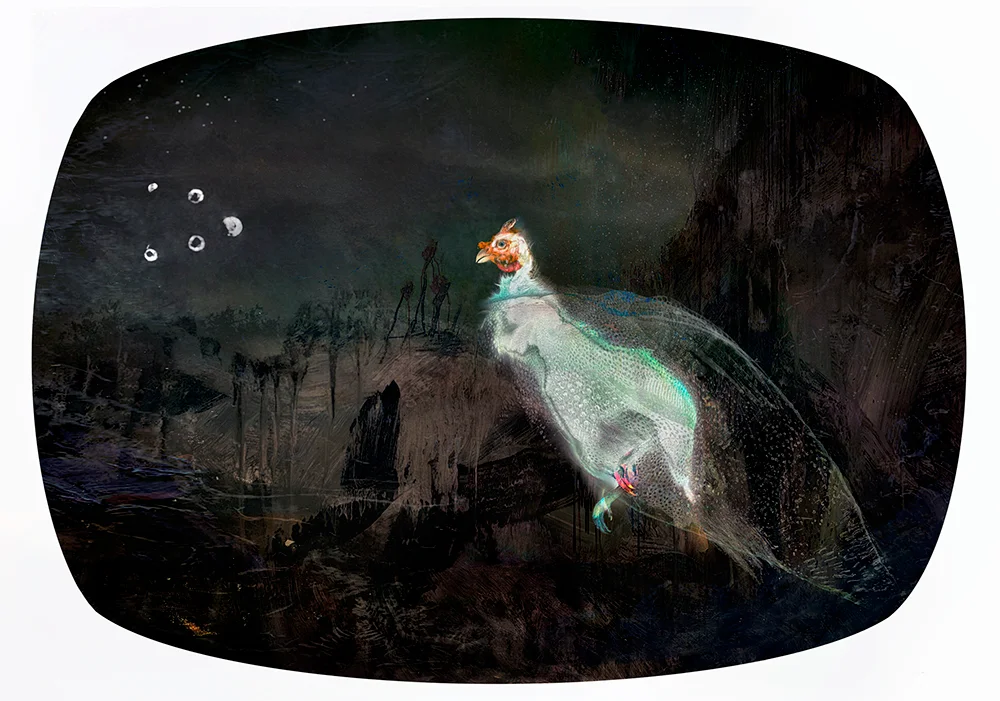 I create afterlife portraits from cadavers using light reactive paper, and techniques I’ve invented layering practices like lumen printing, cliché-verre & chemigram with painting and drawing. Decomposition chemistry is harnessed for colour and detail. Normally the works are exposed 30—50 hours. I make these portraits to honour animals and birds with whom we share this planet. My practice has evolved from reconnecting with my heritage - the Bpangerang from whom I am descended, and my Warlpiri friends who are like family. This little Guinnea fowl was killed by foxes. She was dropped one night as they fled from the yard—and died soon afterward. There were shooting stars in the sky, as if they had come to bear witness. Jenni lay on the light-sensitised paper for 47 hours, under that meteor shower. After the print emerged, I wrapped her in paperbark and left her in a hollow tree.