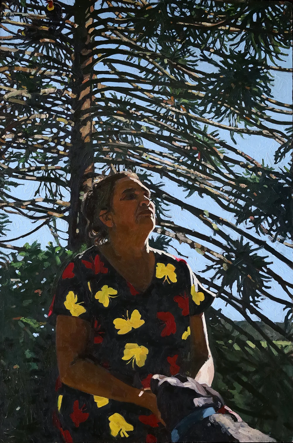 This painting depicts Kabi Kabi Elder Aunty Beverly Hand with her ever present companion Fella. It seeks to capture her deep cultural and spiritual connection to the ancient Bunya in the background which likely well predates colonisation. Bev is Elder in Residence at the Sunshine Coast University and organiser of Bunya Dreaming, an annual celebration of the significance of the Bunya pine (Araucaria bidwillii) in First Nations Culture. Bunya dreaming provides a forum for connection to Culture, Country and reconciliation.