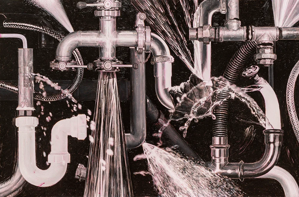 Managing Reality (Still) belongs to a series I made in 2022 using water as a metaphor for different psychological states or experiences. This—and one other bursting pipe painting—are about coping (just). What is ‘too much’ for someone is an impossible thing to predict or measure. Not only between different people but for the same person on any given day or hour. One day we fall apart from the smallest concern, and the next week, go to work while our worst nightmares come true. Managing Reality (2022, collection Art Gallery of NSW) and Managing Reality (Still) (2022), visualise our holding-it-together, that, while easier on some days than others, is the way we make it from one end of a human life to the other.