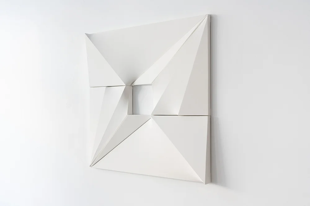 Centric II is created as a six-piece modular work. Hung in this original square formation, the work reveals an inner intimate small centric square that creates a void to invoke the wall as its ground. The painting uses angular, linear relief devices to imply momentum and movement within the confines of the canvas and support, subtly probing the limits of itself as a painting. Utilising the white monochrome as a mode to encourage interplays of light, space and perception, the work further creates dualities and dialogues between 2D and 3D, and tones within the light and dark spectrum, to subverting the illusionistic internal gaze associated with painting. At its simplest core Centric II explores how the square is purported by Christine Herter in her book Dynamic Symmetry as the originating shape from which all other shapes are said to be derived, a foundation from which wider complexities can grow.