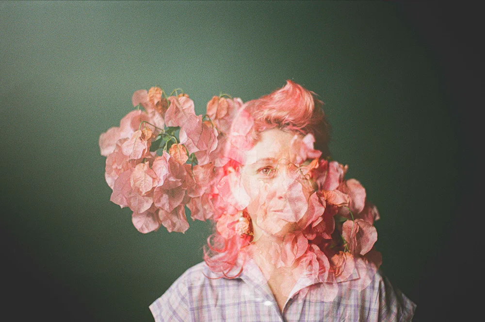 This image shows the artist’s dear friend and collaborator morphing into a bougainvillea blossom or is it the other way around? The merging of 2 photographic images makes it difficult to tell and mesmerizing to view.
