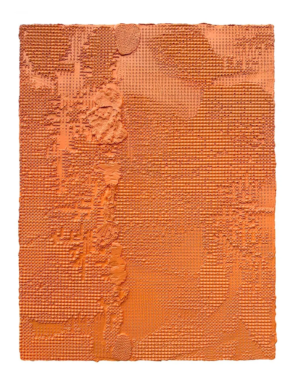 Street in the Afternoon Sun is a work of orange hues and textured surfaces created with plaster and acrylic paint. The work is part of an ongoing series titled Landscapes which explores the evolving nature of the urban landscape with particular focus on the integration of screen technology. The series focuses on materiality, surface, and texture, emphasizing the relationship between screens and urban spaces. By abstracting these elements, the artwork challenges the seamless integration of media in the environment. A singular colour palette unifies the series, allowing each piece to be read as both a landscape and a screen. Street in the Afternoon Sun prompts viewers to contemplate the complex relationship between physical and digital realities. Through colours, textures, and abstract forms, it encourages engagement and deeper understanding of our intertwined existence in the physical and digital world.