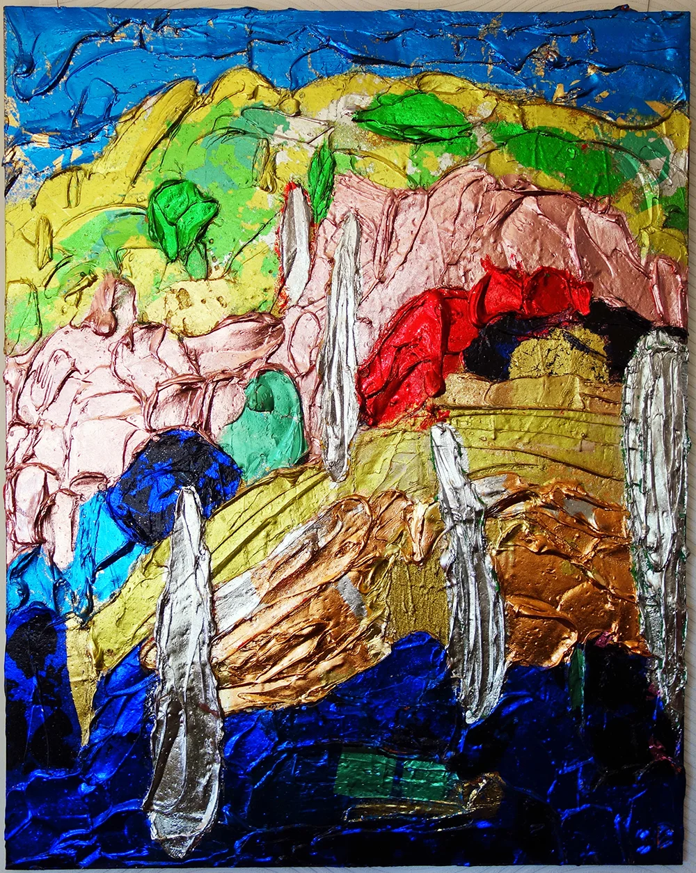 ‘Cinderella Land’, incorporates both found and acquired source materials in an experimental approach to the development of a 2D artwork. More aligned with sculpture than painting the surface shimmers, due to the incorporation of the highly reflective and intensely coloured metal leaf and the underlying highly textured undulating surface of the canvas. As the viewer navigates past the work hanging in a gallery, it shimmers and shines with an intensity never before seen.